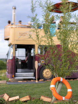 The Hot Tub Bus takes your PAUS experience to the next level. Enjoy views over our bathing space and the countryside for miles beyond. Aboard, you will find three wood-fired hot tubs on the top deck, hot showers, a cooling chamber on the lower deck, and even your very own 'bus conductor'.