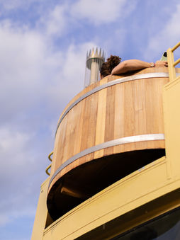 Originally from PAUS's parent business, Bathing Under the Sky - this globally unique bathing sensation carries the spirit of our festival heritage. Now at PAUS for the summer, it offers an unforgettable experience with elevated panoramic views, wood-fired warmth, and an exclusive bus lawn area.